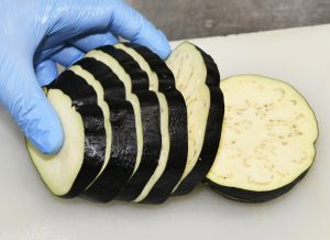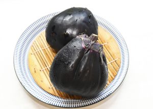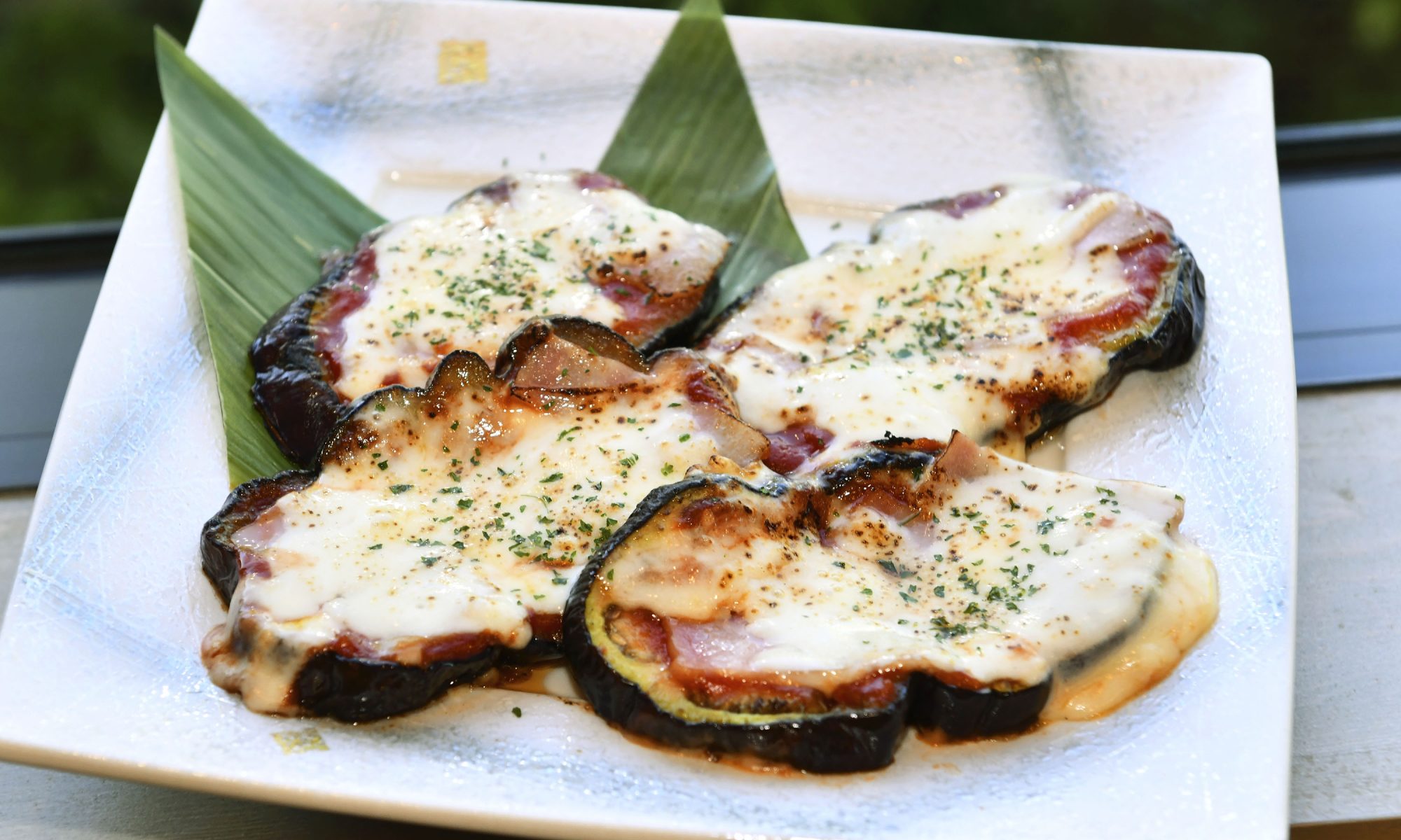 三豊ナスは一般的な千両ナスより約3倍大きく、柔らかい皮とみずみずしい食感の果肉が特徴。ナスに乗せる具材としてタマネギやピーマンを加えてもよい。