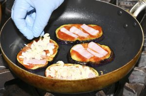 ④ ③に、②、ベーコン、チーズの順に乗せ、ふたをしてチーズが溶けるまで火を通す。ナスがとろとろになっているので、崩れないようにへらなどを使って皿に盛る。