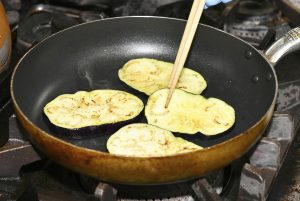 ① ナスのヘタと尻を切り落とし、1センチの厚さに輪切りする。ボウルに入れ10分ぐらい水にさらし、あく抜きをする。