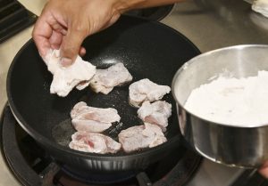 ② 一口大の鶏もも肉を用意し、両面に塩・こしょうを振る。強力粉をまぶし、油(分量外)を引いた鍋に入れる。ニンニクを入れ香り付けをし、鶏肉にしっかり焼き色が付いたら裏返す。裏面も少し焼き色が付いたら一度肉を取り出す。完全に火が通っていなくても問題ない。肉から出た油は捨てる。