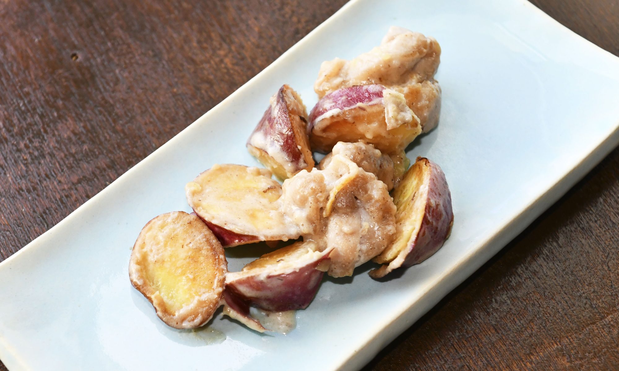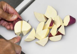 ① サツマイモは皮付きで乱切りにする。でんぷんを逃がさないようにするため、水にさらさない。