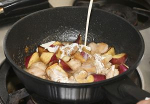 ④ ③に具材が半分漬かるぐらいの水を入れ、約10分煮る。水がほぼなくなったら生クリームを加え、ひと沸かしさせたら完成。