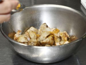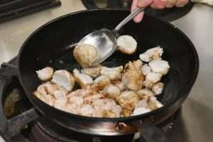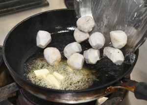 ③ ②に切ったエビを入れる。火を止め、サトイモをスプーンなどを使い、食べやすい大きさに割る。エビより少し大きめが良い。再び火を付け、塩を振りかける。全体に焼き色が付いたらボウルに移す。