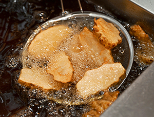 ② ①を5ミリ幅にカットし、180度の油で2分程度素揚げする。揚げ時間の目安はこんがり色づくまで。