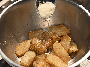③ しっかり油を切った②をボウルに入れ、塩ひとつまみと粉チーズを振りかける。キクイモが熱いうちにあえるのがよい。