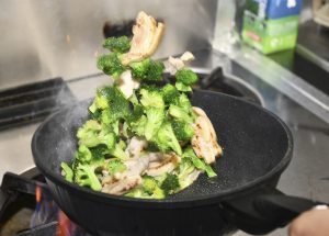 ④ 米粉を適量の水で溶く。ドロッとした状態になったら③に入れる。再度沸騰させ、②で取り出した鶏肉とブロッコリーを加えて全体に絡める。