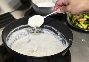 ③ みじん切りにしたタマネギと牛乳をフライパンに入れ、沸騰させる。お好みで塩とこしょうで味付けする。