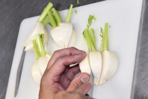 ① カブの根を落とし、好みの厚さに切る。カブの風味を味わえるように厚めに切るのがお勧め。切った後に皮をむく。油に入れる際に持ちやすくするため、茎は切り落とさずに残しておく。