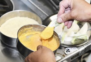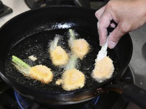 ③ ボウルに卵を溶き、天ぷら粉ぐらいの硬さになるよう強力粉を加える。②の余分な粉をはたき、液にくぐらせ、パン粉を付ける。