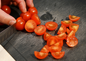 ① ミニトマトはへたを取り、半量を4等分、もう半量は果肉の食感を感じられるように半分に切る。