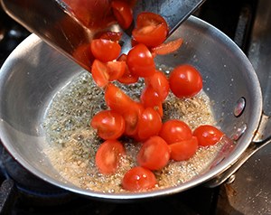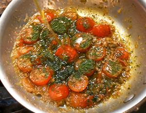 4等分に切ったトマトをつぶしながら混ぜる。火にかけたままオリーブオイル(20㏄)とパセリを加え、火から外して全体に絡める。