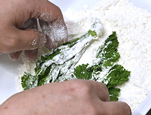 ① 鍋に湯を沸かして塩を加え、火を止める。ナバナを2~3秒さっと湯に通す。ナバナが重ならないようにザルに広げて冷まし、水分を拭き取って強力粉をまぶす。