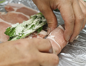 ② ラップを敷き、豚ロース2、3枚を広げる。①のナバナを2本取り、肉の上に葉と茎が交互になるように並べる。肉から飛び出たナバナはカットし、きつく巻いていく。これをナバナを使い切るまで繰り返す。