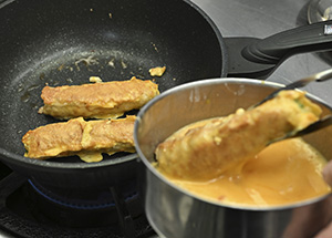 ⑤ ④を卵液にくぐらせて同様に焼く工程をあと2回行い完成。卵を分厚くしたい場合は、回数を増やしてもよい。