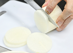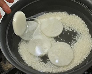 ② 鍋に米、水、大根を入れ、ふたを少しずらして加熱する。煮立ったら、沸騰が止まらない程度のとろ火にする。かゆが炊き上がったら大根を取り出す。
