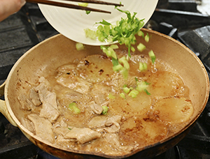 ④ 大根ステーキのたれを混ぜ合わせておく。③に豚肉を戻し、たれと大根の葉を加えてさっと煮立たせる。