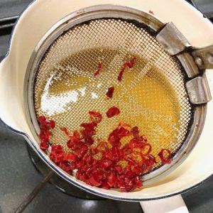 3)火を止めたまま刻んだ香川本鷹を入れ(写真)、そのまま5分、オイルに辛味と香りを移す。その後、すくい網で本鷹を取り除く。