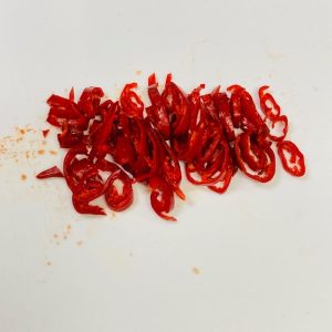 1)にんにくは硬い部分を切り落とし、皮をむいていく。鷹の爪は辛く仕上げたいときは種ごと、マイルドに仕上げたいときは種を取り除いて輪切りに刻んでおく(写真:種を抜いた香川本鷹の輪切り)。