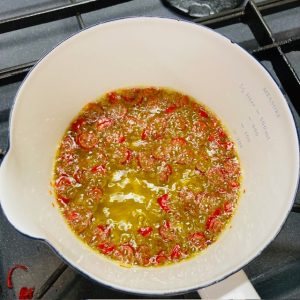 今回は香川本鷹を使った「ピカンテオイル」をご紹介しましょう。ピカンテ=辛い、という意味で、イタリアでは辛いパスタやピザに使用する一般的な辛味オイルです。ごま油で作ればラー油ですね。