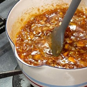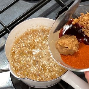 4)火を止め、すぐに調味料を入れ、小さなヘラなどで全体をよく混ぜる。冷めたら保存用のビン(容量250mlで入る)などに移しておく。冷蔵庫保存で10日くらいもつ。
