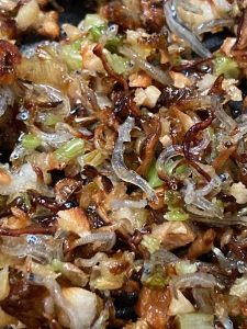 1)白ネギ、にんにく、しょうが、ナッツ類はみじん切りにしておく(写真)。