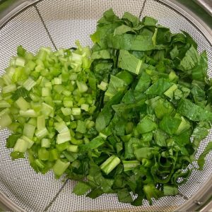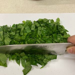 1)小松菜は水洗いしてしっかり水気を取り、葉と茎に切り分ける。葉と茎それぞれ1センチ弱の幅に切っておく。葉は細長くなってしまうので、包丁を横にも入れて短くしておく(写真)。