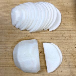 1)ハマチは5mmくらいの薄切りにする。かぶは皮をむいて3−4mm(ハマチより薄切り)に切る(写真)。ドレッシングを合わせておく。鮮度のいい葉付きのかぶなら、葉2枚くらいをせん切りにしておく。