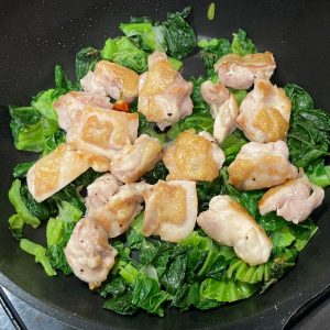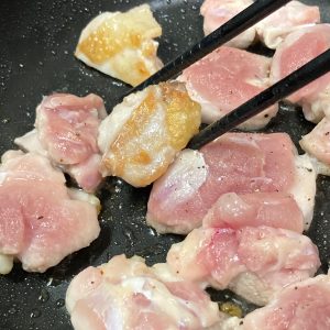 2)鶏肉は一口大に切り、しょうゆと日本酒で下味を浸けておく。フライパンにサラダ油大さじ1を入れ、にんにく、唐辛子を入れ、鶏肉の皮側から先に焼くように並べ、中火で約5分、皮から脂が出て色づいたら(写真)返して両面焼く。にんにくは香りづけだけなので、焦げる前にフライパンから出しておく。焼いた鶏肉はボウルなどに取り出しておき、そのままのフライパンに切ったまんばを入れ、ほぐしながら炒める。